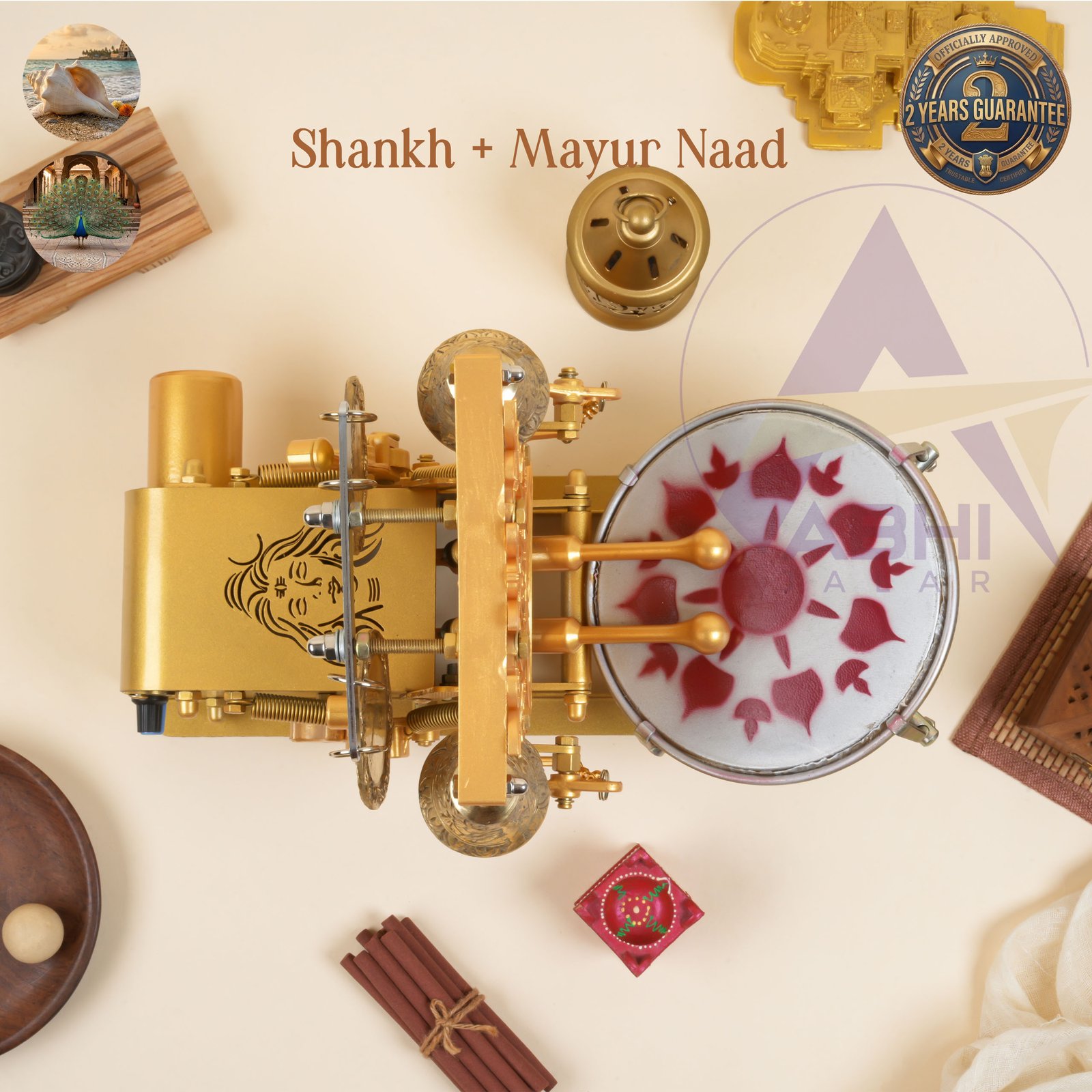 - Nagara Sound (Brass & Alloy): Small Arti Machine has The brass-alloy composition produces resonating sounds, which help create a peaceful, spiritually enriching environment.